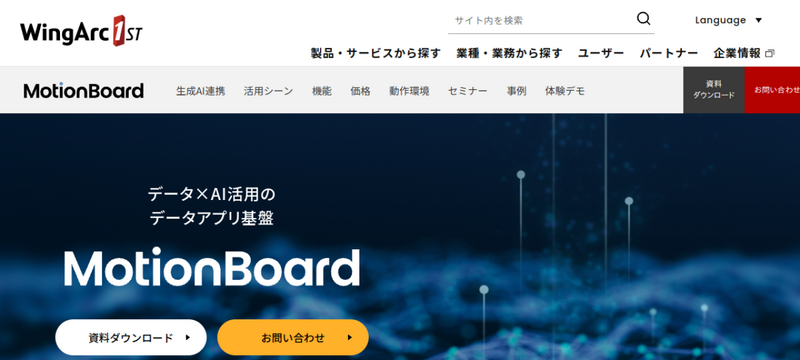 MotionBoardは、ウイングアーク1st株式会社が提供するデータ×AIを活用したデータアプリ基盤です。ブロックを組み合わせるような設計でダッシュボードを作成でき、現場部門による内製化を進めやすい点が特長です。