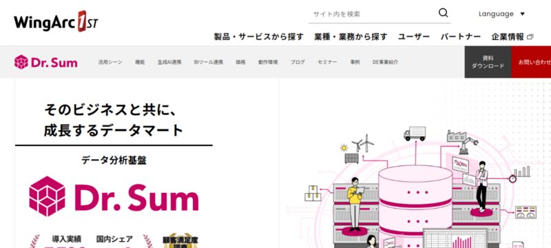 Dr.Sumは、ウイングアーク1st株式会社が提供する「ビジネスとともに成長するデータマート」です。特許取得の高速集計エンジンを搭載し、業務で生成される大量データの収集・事前加工・蓄積・集計を一手に担います。