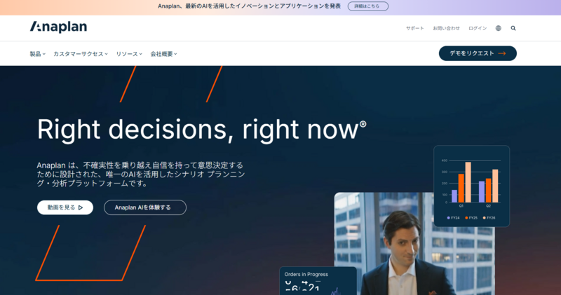 Anaplanは、Anaplan, Inc.が提供する企業向け計画プラットフォームです。ファイナンス、セールス&マーケティング、サプライチェーン、HR&ワークフォースといった主要領域の計画業務を一つの基盤に統合し、AIの活用によって部門横断のシナリオプランニングと分析を実現します。