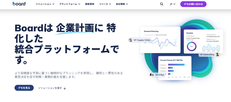 Boardは、Board Internationalが提供する企業向け計画プラットフォームです。財務計画・販売実績管理・人員計画・サプライチェーン計画といった主要領域を一つの基盤で扱え、Board AIやシナリオ型予測を活用した意思決定支援にも対応します。