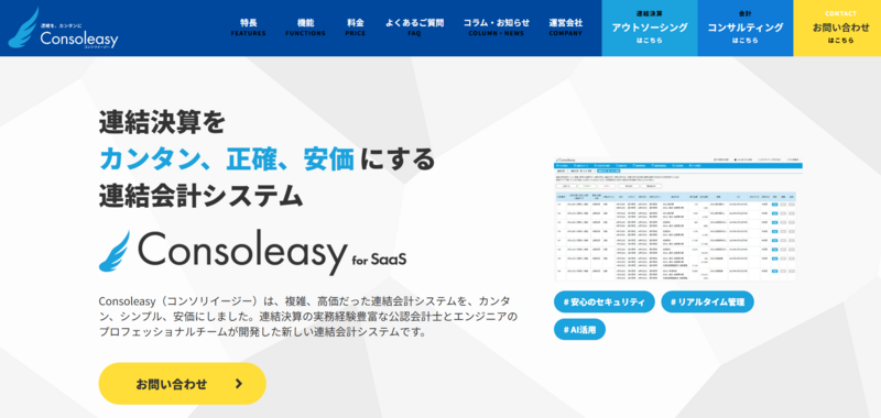 コンソリイージーは、エールアカウンティング株式会社が提供するクラウド型の連結会計システムです。内部取引消去や持分法適用といった連結固有の仕訳処理に対応し、連結決算業務の早期化と工数削減を支援します。