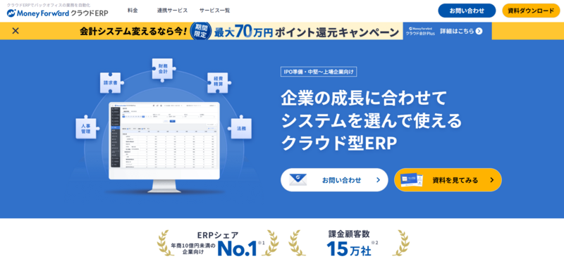 | マネーフォワード クラウドERP | 要問い合わせ | 要問い合わせ | 成長に合わせ組み替えるコンポーネント型ERP |