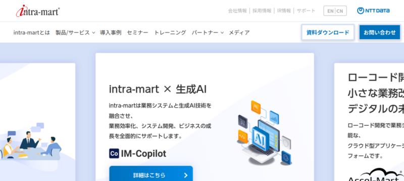 intra-martは、株式会社NTTデータ イントラマートが提供する業務改善プラットフォームです。ワークフロー・BPM・ローコード開発・業務アプリケーションを一つのシステム共通基盤で扱え、業務プロセスのデジタル化と自動化を幅広く推進できます。