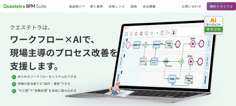 Questetra BPM Suiteは、株式会社クエステトラが提供するクラウド型のBPMSです。業務のワークフロー図を描いて設計し、そのまま業務アプリとして稼働させられる点が特徴で、設計・運用・モニタリングまでを一つの基盤で扱えます。