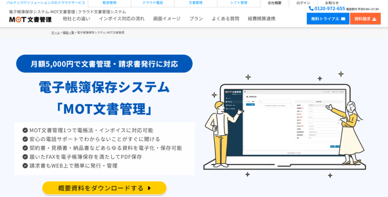 MOT文書管理は、株式会社バルテックが提供するクラウド型の文書管理システムです。社内文書の電子化・検索・バージョン管理に対応し、経営企画が管理する社内規程・経営計画書・会議資料など、重要文書の保管と検索性向上に活用できます。