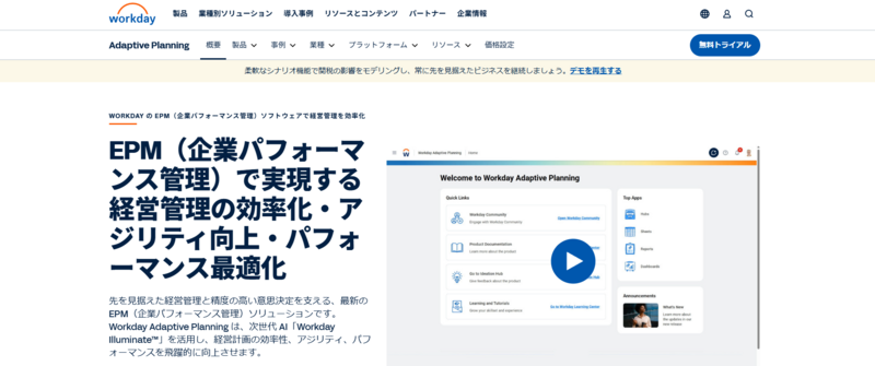 Workday Adaptive Planningは、Workday, Inc.が提供するEPM(企業パフォーマンス管理)ソフトウェアです。ファイナンシャルプランニング・ワークフォースプランニング・オペレーションプランニングに加え、決算処理や連結処理まで幅広い計画領域に対応します。