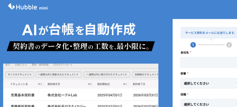 | Hubble mini | 0円 | 要問い合わせ | AIが契約書を自動台帳化する管理特化型CLM |