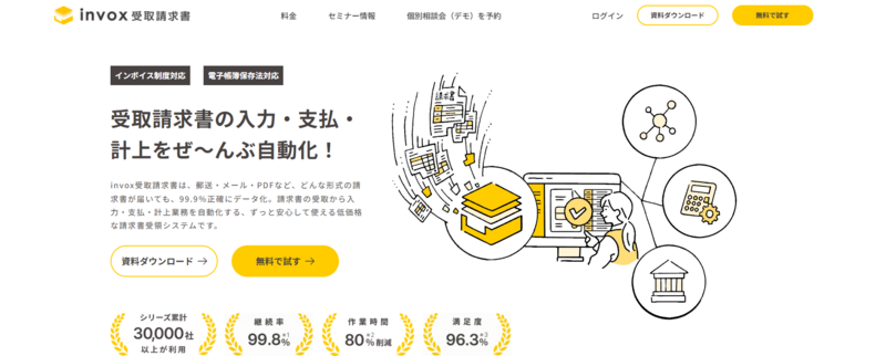 請求書・領収書の受領・データ化に特化したサービスです。AI-OCRによる即時データ化と、専任オペレーターが確認するハイブリッド方式を組み合わせ、高いデータ化精度を実現しています。
