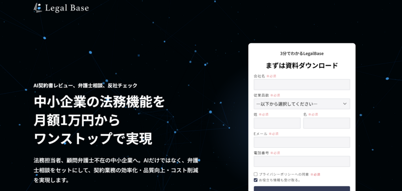 契約書雛形のダウンロード、文書管理、反社チェックなどもワンストップで扱える点が特徴です。法務リソースが限られる中小企業が、法的リスクをコントロールするための入口として機能します。