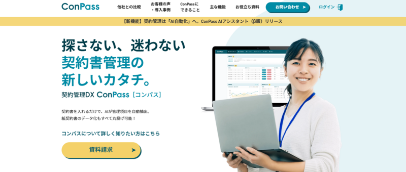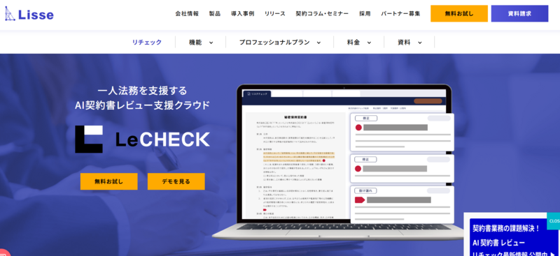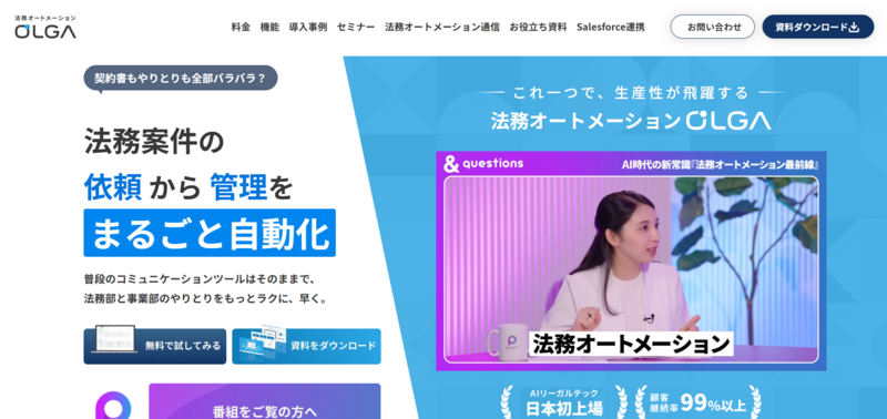 法務部門と事業部門のやりとりを円滑にする依頼受付・進捗管理機能も備えています。過去契約との文書比較や類似案件のレコメンド機能もあり、契約書データを組織のナレッジとして活用したい企業に向いています。