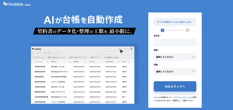 株式会社Hubbleが提供するAI契約業務・管理クラウドです。締結済み・進行中の契約書を一元管理しつつ、AIが契約相手方名や自動更新の有無などの情報を読み取り、管理台帳を自動で作成します。