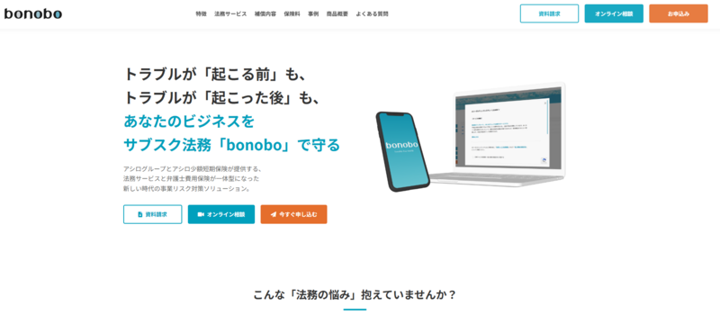 株式会社アシロが提供する、事業活動で発生する法的トラブルに備える弁護士費用保険です。弁護士費用の補償に加えて、AIによる契約書レビュー、契約書ひな形、反社チェック、法務チャット相談までを月額定額でパッケージ化した「サブスク法務」として提供されています。