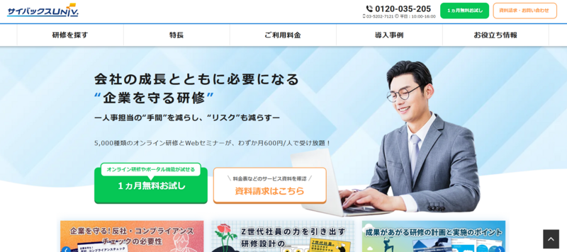 コンプライアンス教育を全社員に定額で展開したい法務・人事部門に向いています。サイバックスUniv.は、リスクモンスター連結子会社の株式会社サイバックスが提供するeラーニングプラットフォームで、約5,000コースの研修を定額で受け放題です。