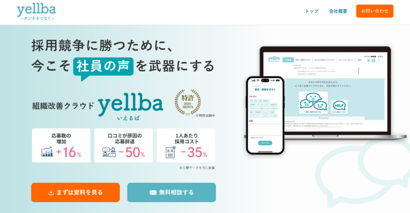 | yellba | 0円 | 30,000円~ | 組織改善プラットフォーム。ボトムアップの組織課題解決に強み |