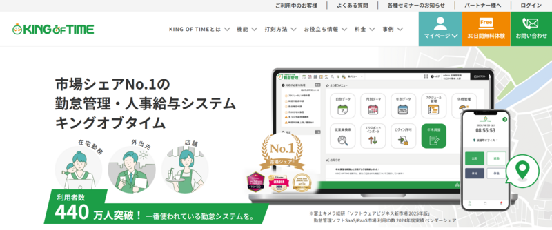 利用者数440万人超(2026年4月時点)にのぼり、シフト管理・休暇管理・残業アラートなど、勤怠管理に必要な機能を幅広く揃えています。