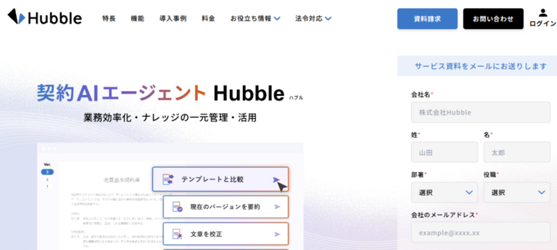 契約書のやり取りがメール・Slack・ファイルサーバに散らばり、台帳はExcelで手入力している法務部門の業務改善に向いているのが、株式会社Hubbleが提供するAI契約業務・管理クラウドサービス「Hubble」です。