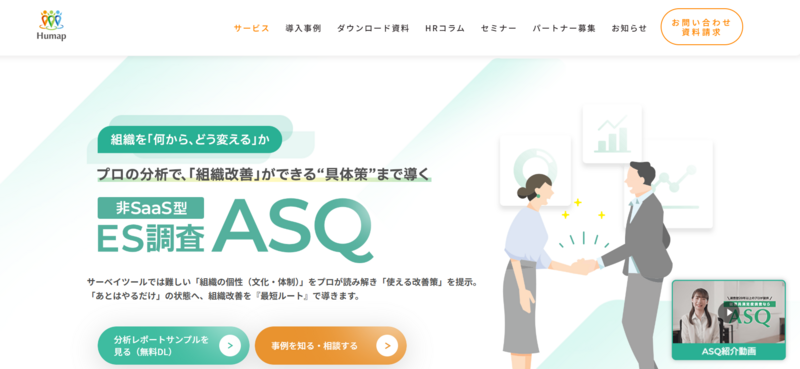 経営企画担当者が活躍できる組織風土かどうかを定期的に診断したい場合に活用できるES調査ツールです。ASQは株式会社アスマークが提供する従業員満足度調査で、月額固定費なしの買い切り型のため、必要なタイミングで実施できます。