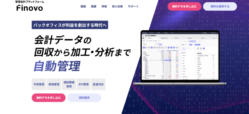 Finovoは、株式会社Finovoが提供する管理会計プラットフォームです。散在する財務・非財務データの回収から加工、分析までをノーコードで自動化・高度化することが訴求軸となっています。