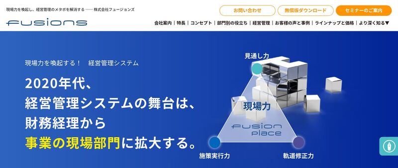 fusion_placeは、株式会社フュージョンズが提供するクラウド経営管理ワークプレイスです。多次元×詳細大量データの統合分析と、Excel資産の活用を両立させる設計が訴求軸になっています。
