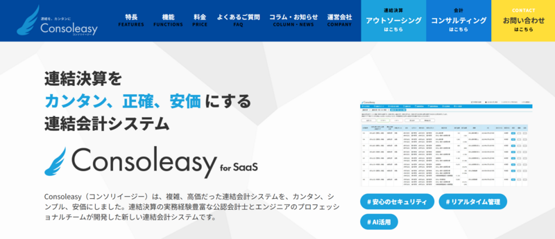 コンソリイージーは、エールアカウンティング株式会社が提供するクラウド連結会計システムです。経営企画担当者の手作業に依存しがちな連結用の組替仕訳や資本連結処理を、自動仕訳機能と異常検知機能で仕組み化できる設計が特徴です。