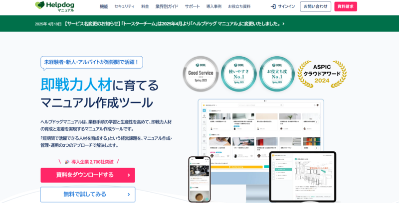 | ヘルプドッグマニュアル | 要問い合わせ | 3万5,000円〜 | AIが自動でマニュアルを作成するナレッジ管理クラウド |